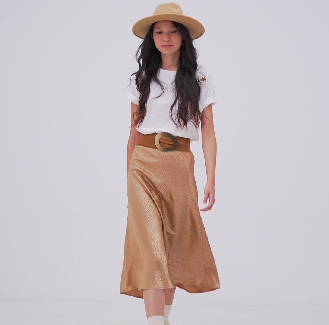 Con un estampado abstracto de inspiración animal, esta falda capta la atención de inmediato. El color dorado añade un toque de glamour que ilumina cualquier atuendo. Ya sea que la combines con una blusa simple o que la lleves con un top llamativo, la falda es versátil y chic.